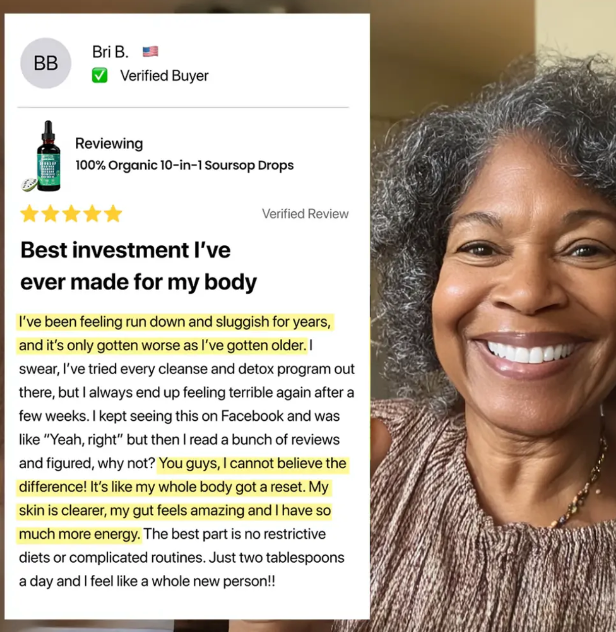 "I been so tired lately, just runnin after my kids all day and then going to my job at night, it was getting real hard. My friend Sarah, she telled me about these soursop drops she was taking. I figured, why not, can't hurt to try, right? After like a week, maybe a little more, I really feel like I got more go-power, not so sleepy in the middle of the day. I can actually play with the kids after supper now instead of just wanting to crash on the couch. Its good stuff, I think. Glad I tried it and I'm gonna keep buyin it."